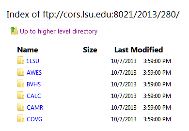 C4G has HTTP as well as anonymous FTP access to raw data from most of the CORS sites in Louisiana and our partner sites along the Gulf Coast. To access CORS data by HTTP, go to http://CORS.LSU.EDU with your browser or by FTP @ftp://cors.lsu.edu:8021/ or in your FTP client at the following settings.
