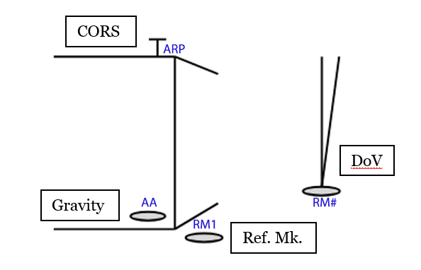 - The CORS is usually accompanied by 3 or so reference marks (RMs) and absolute gravity marks (AAs) that are tied to the CORS and each other by tacheometry, plus an RM for DoV observation.